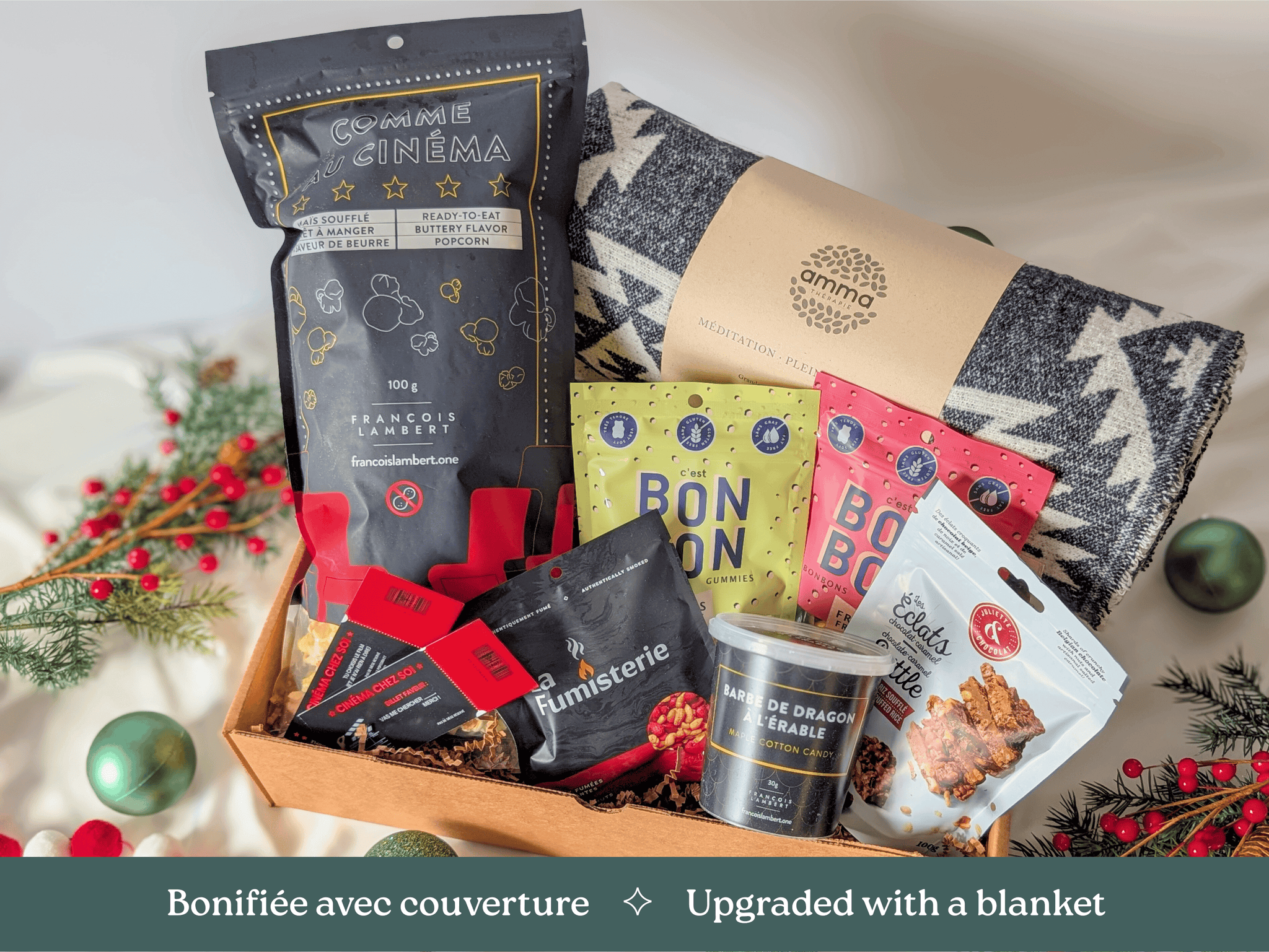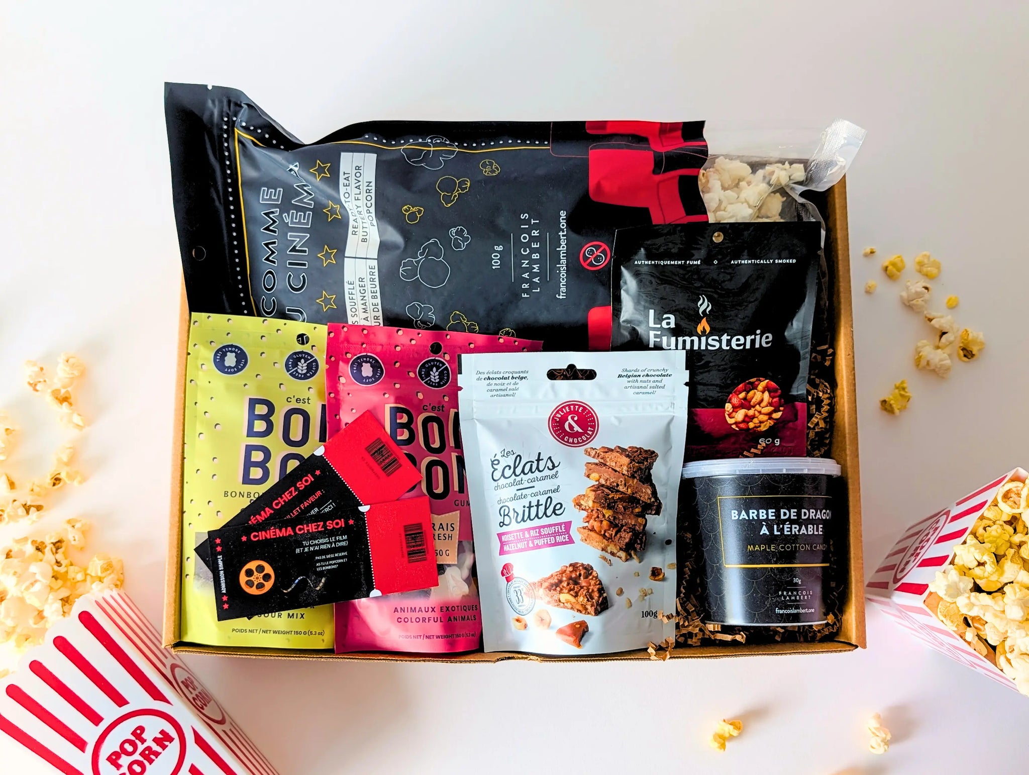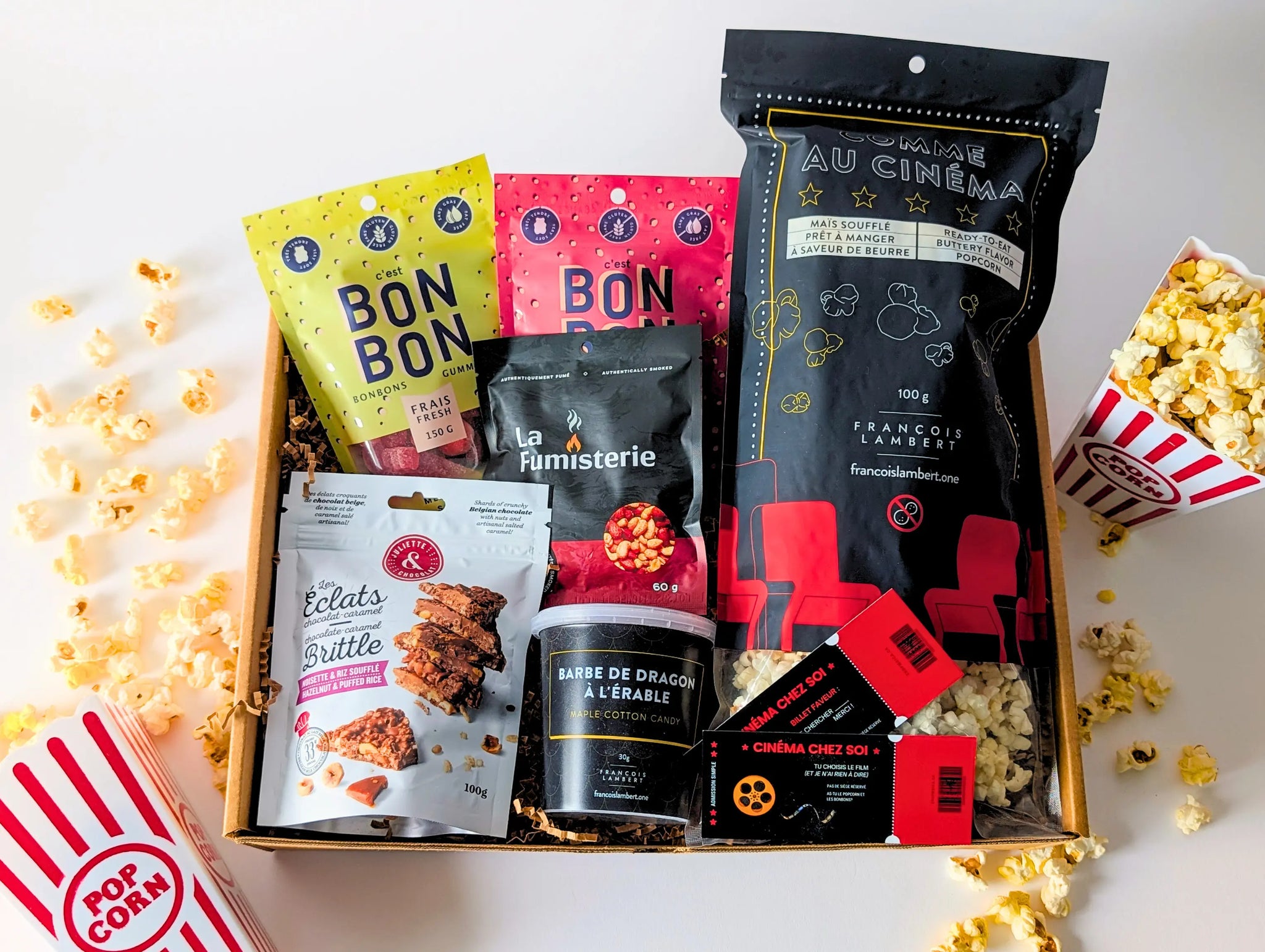 La boîte Cinéma maison est parfaite pour une soirée film et série ''sul'' sofa à la maison. Vous aurez tous vos essentiels pour un Movie night 100% réussi!