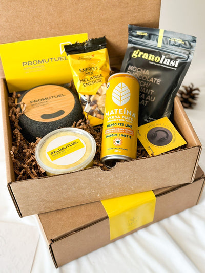 200 boîtes à livrer à 4 succursales lors d’un événement commun. Ligne directrice pour l’expérience cadeau et le contenu: Nouveau départ, nouvelle année, nouveau regroupement! Dose d’énergie pour lancer le tout en GRAND! Promutuel désire également l’inclusion d’un article durable personnalisé en lien avec la thématique dose d’énergie.