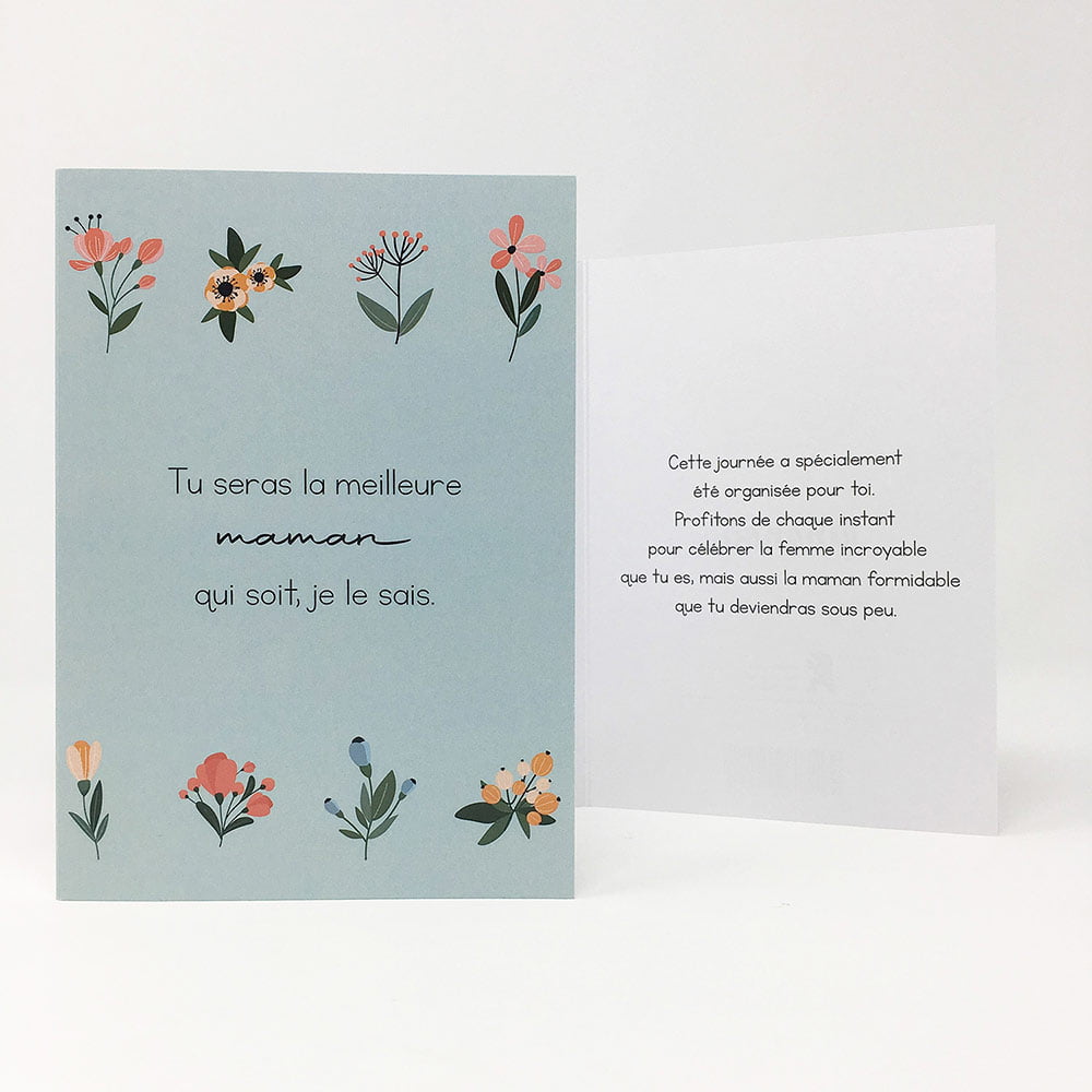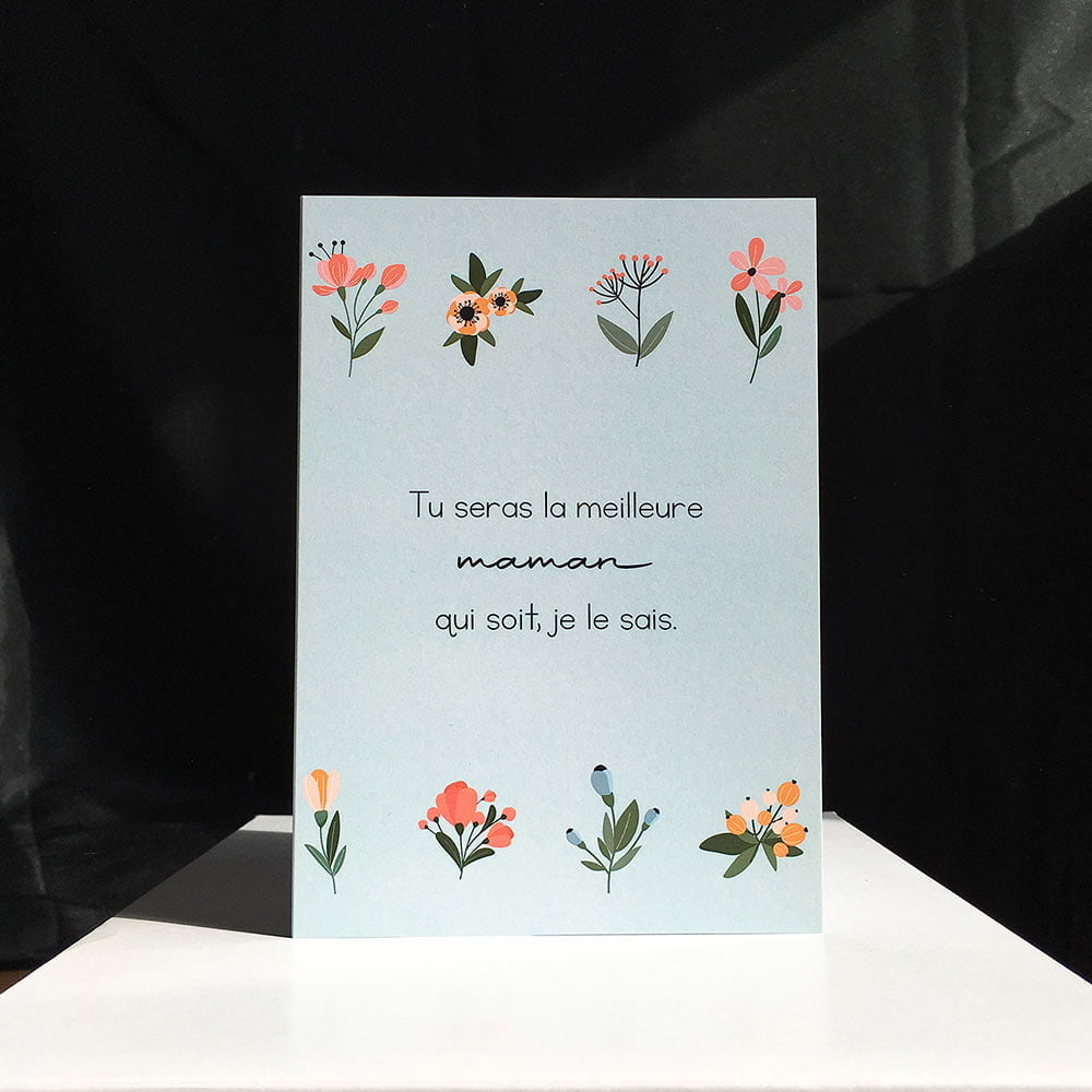 La carte de souhaits Meilleure Maman offre un design doux, en plus d’un message attachant et mignon en français pour accompagner nos boîtes cadeaux.