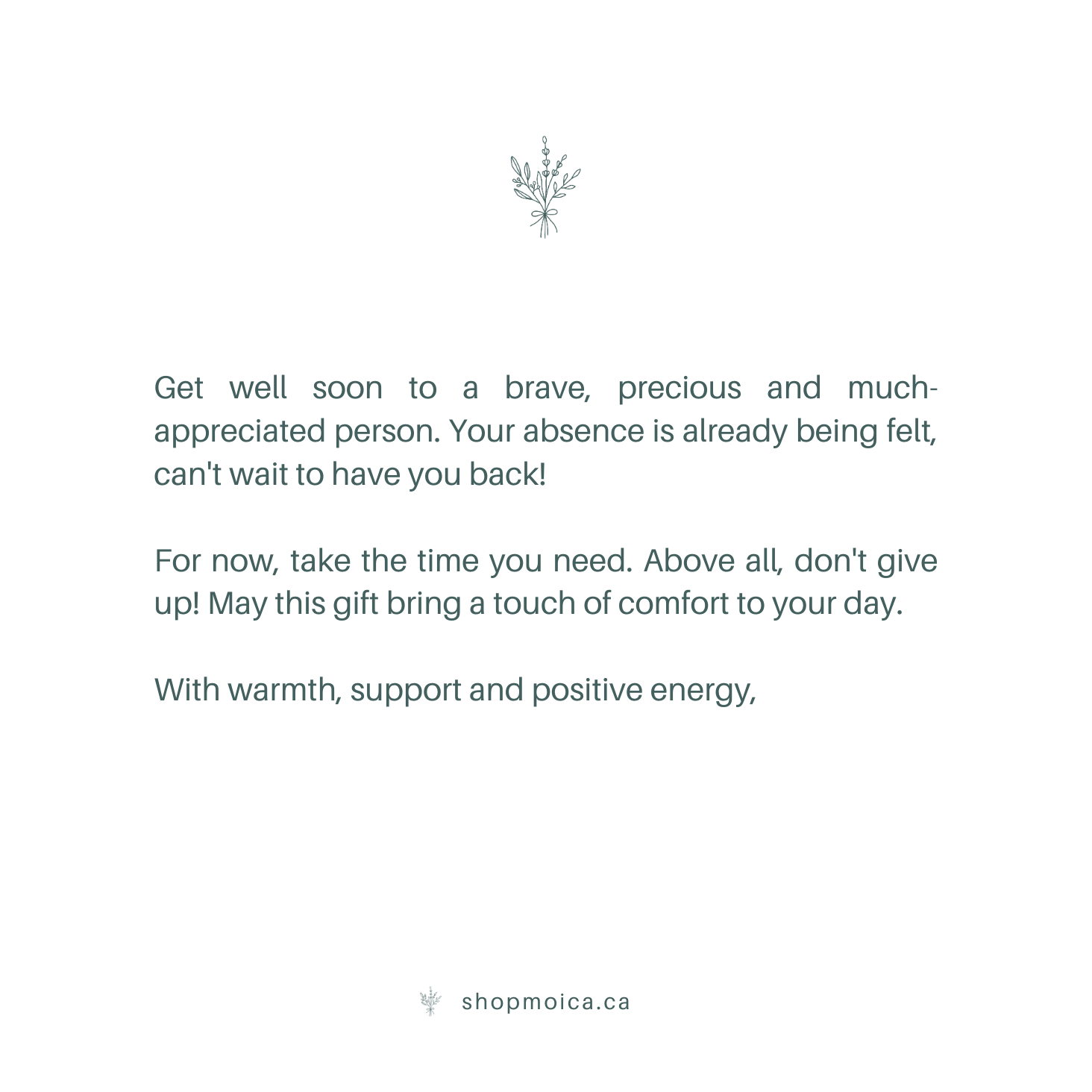 Bon rétablissement à une personne courageuse, précieuse et appréciée. Ton absence se fait déjà ressentir, ton retour est tant attendu! Pour l’instant, prends le temps qu’il te faut. Surtout, ne lâche pas! En espérant que ce présent apporte un soupçon de réconfort à ta journée. Avec chaleur, soutien et énergies positives,