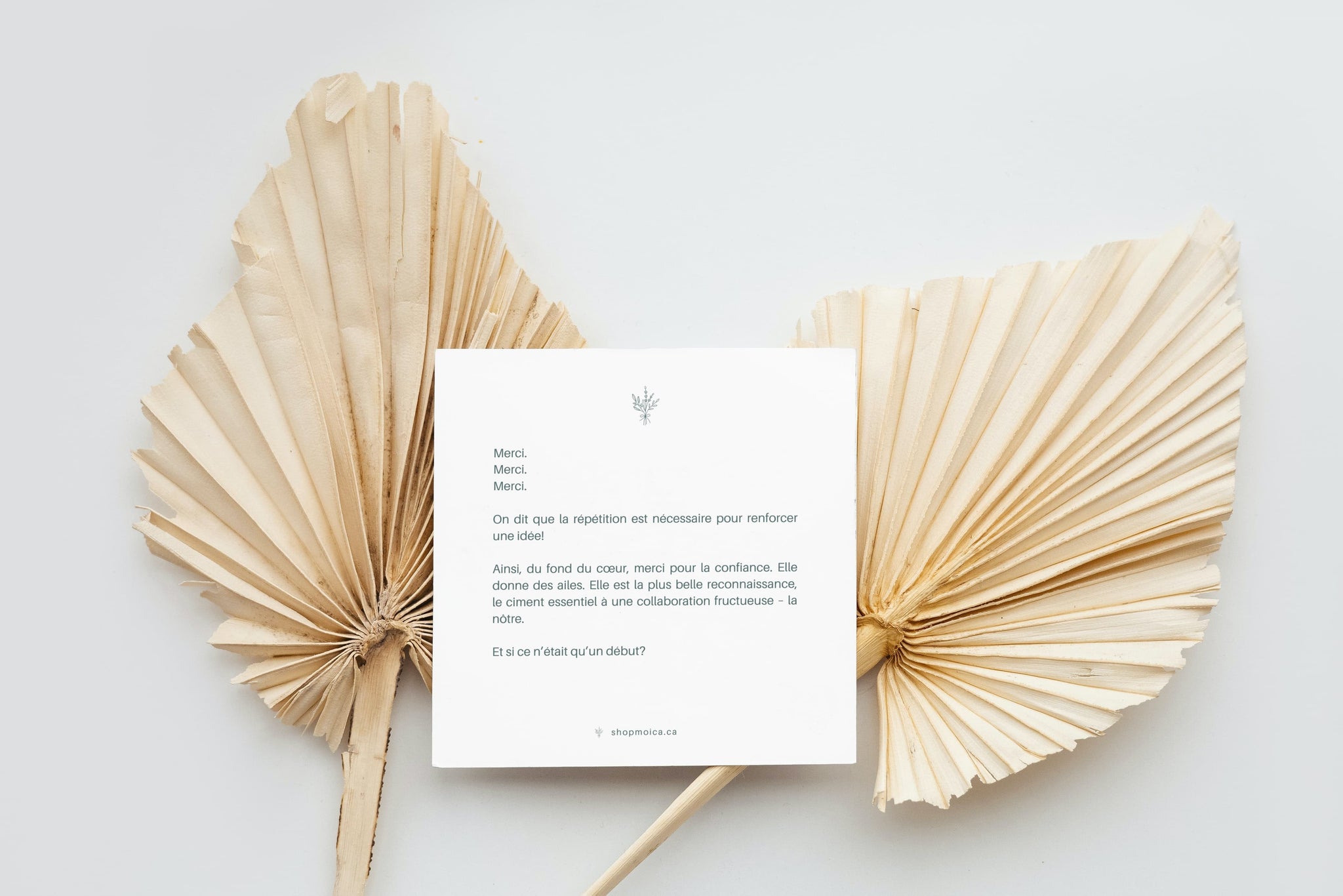 Ajout d'un mot pré-rédigé présenté sur un carton premium. Texte français au recto, anglais au verso. Veuillez inscrire le(s) nom(s) de l'expéditeur pour informer la personne gâtée de qui provient le cadeau, qui sera transcrit à la main sur le carton.